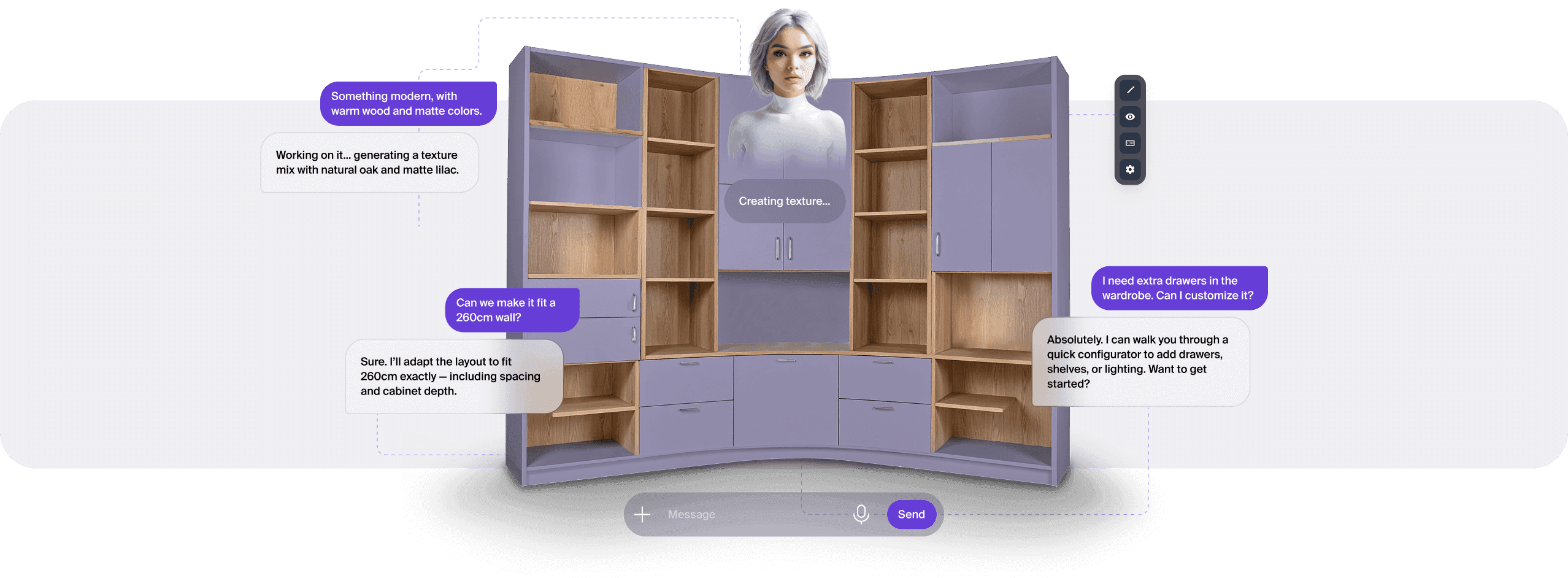 We replace forms and dropdowns with a natural-language interface. Customers can simply say, “I need a wardrobe for a 240cm wall, in matte black with sliding doors,” and get an accurate configuration.